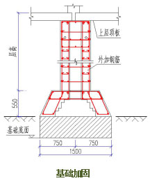 经现场检测及鉴定,厂房立柱根部腐蚀严重,多处保护层脱落,针对上述情况,经过对柱的加固方法比较,采用扩大截面加固法,新增纵筋直接锚固在底部截面扩大区,柱单侧增加厚度50mm。加固方法见右图所示。加固的同时,采用同样的方法增加地梁截面积,提高受损基础承载能力,满足结构安全使用要求。同时,为了提高混凝土密实度,增强混凝土的防腐效果,加固混凝土采用微膨胀细石混凝土。