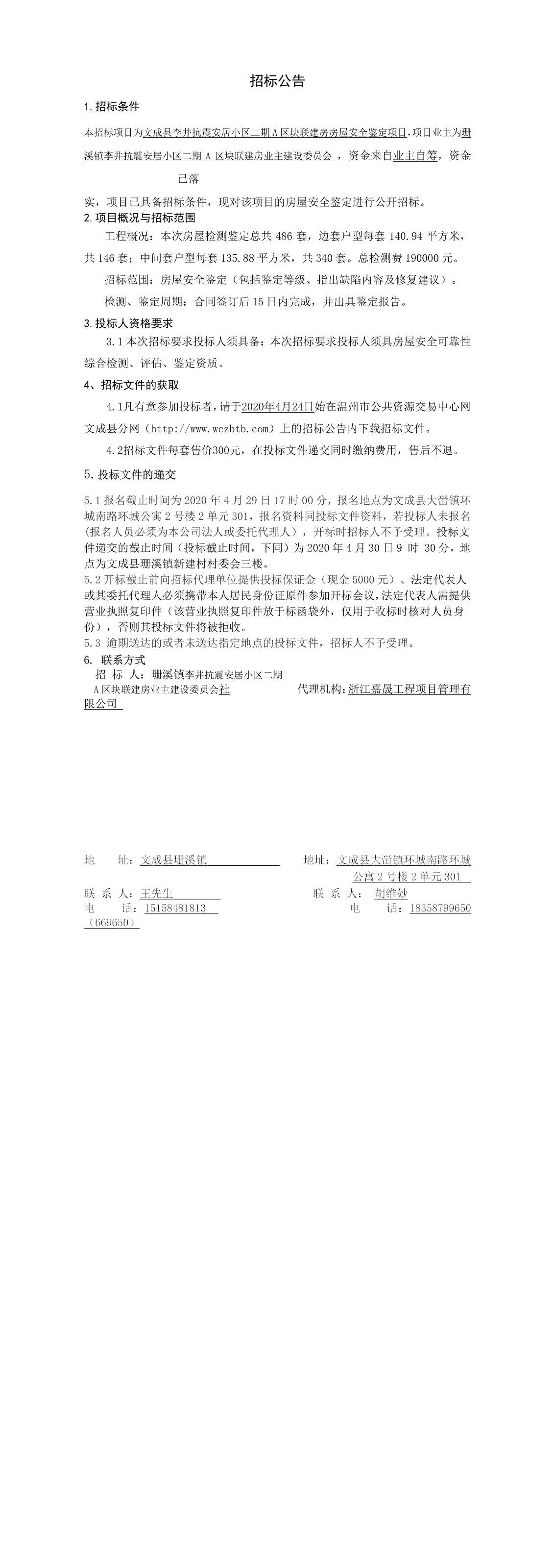 文成县李井抗震安居小区二期A区块联建房房屋安全鉴定项目